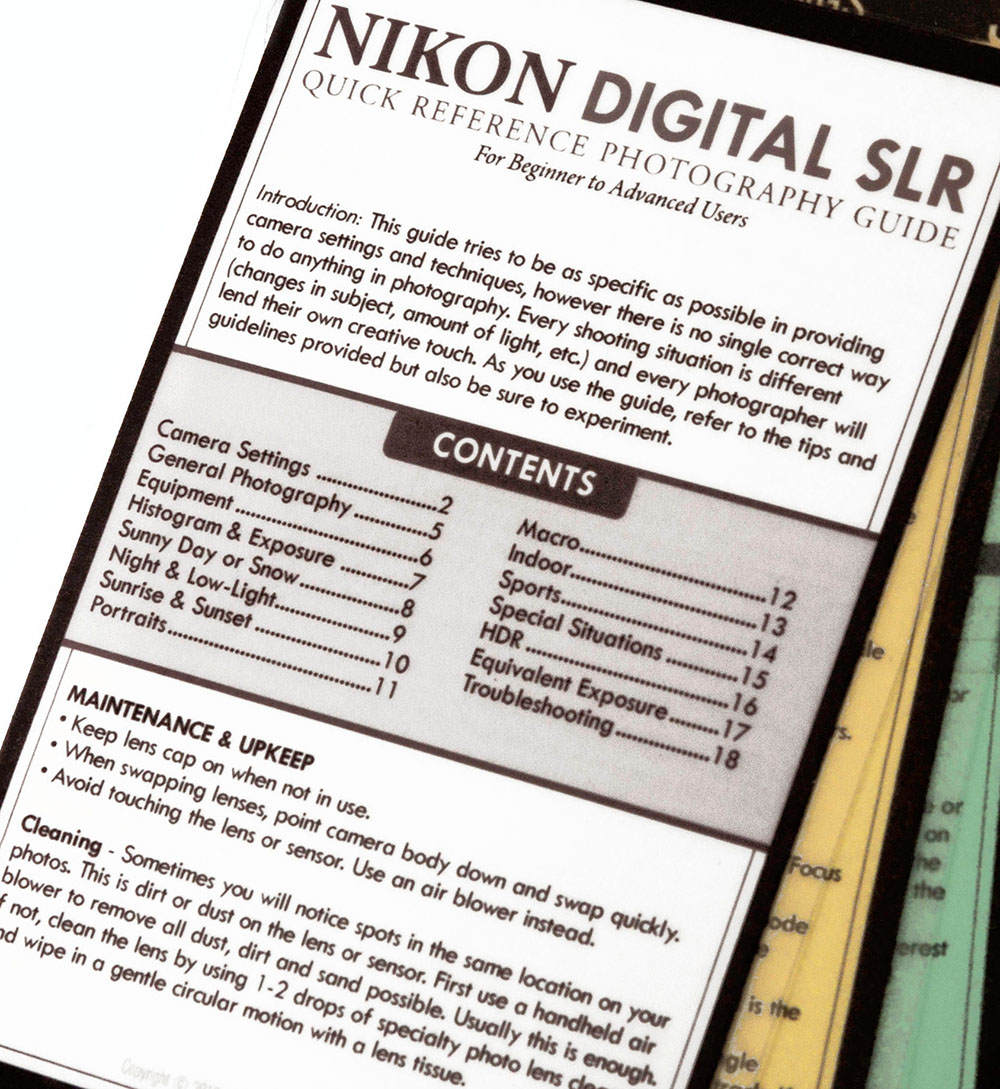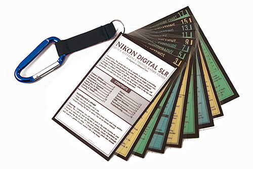 Handy pocket-sized reference cards with everything you need to know while out shooting with your Digital SLR camera. Also helpful for any digital camera that allows you to adjust settings!
